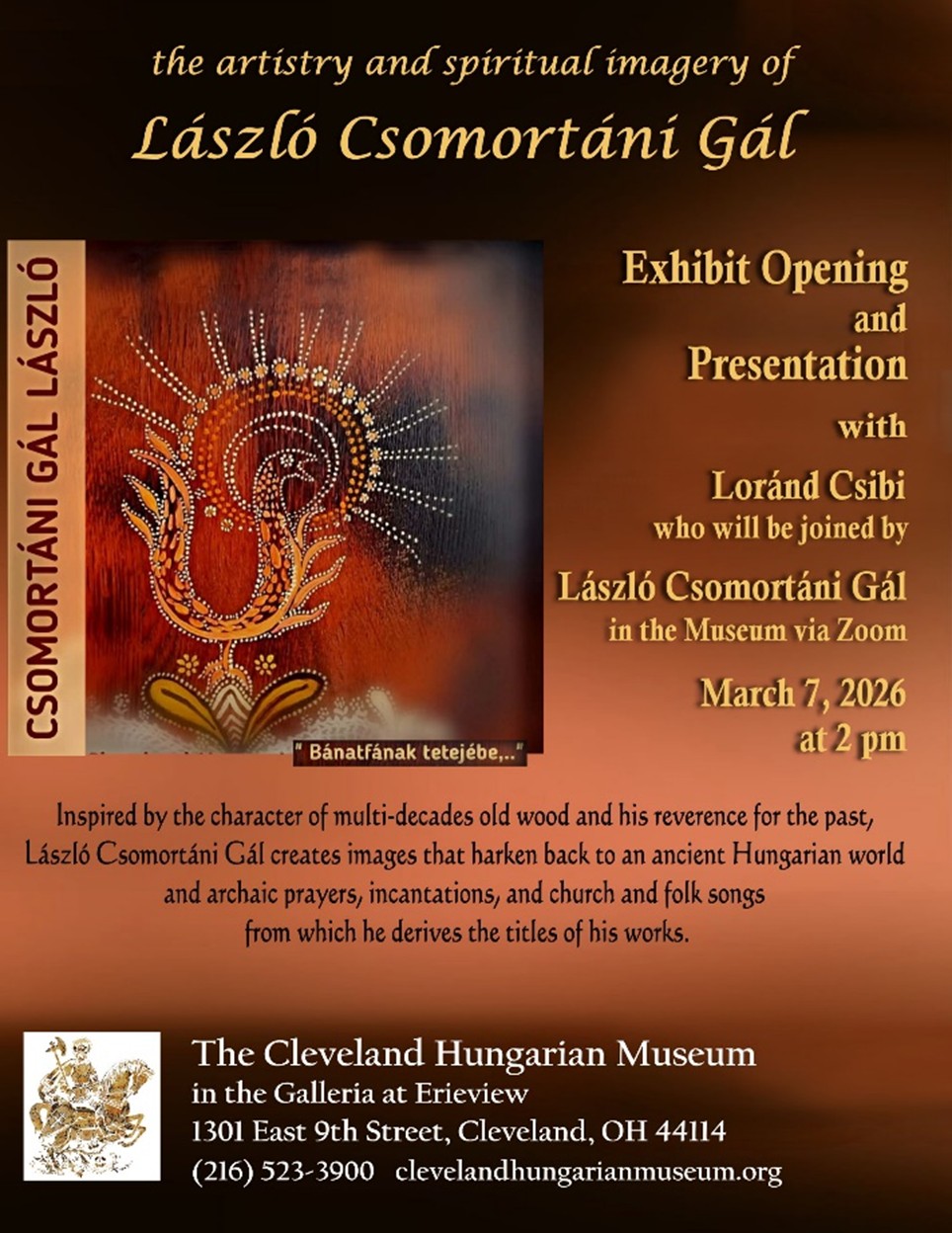 Wonderful works of art by László Csomortáni Gál will grace the walls our Museum. The artist was born in 1978 in Csíkszereda, Romania, a city in Transylvania, home to a large Hungarian population. He grew up in Csíkcsomortán, in a rural environment. He has chosen to continue to follow a simple lifestyle in a state close to nature, which is a great source of inspiration for him. He graduated from the Nagy István Art Lyceum in Csikszereda in 1996, then completed studies in the Sculpture Department of the University of Fine Arts in Oradea in 2003. Since then, he has been living and creating in his native village. László Csomortáni Gál is inspired by the character of multi-decades old wooden planks and his reverence for the past. He creates images that harken back to an ancient Hungarian world incorporating archaic prayers, incantations and church and folk songs into the titles of his creations. He has had more than fifty solo exhibitions mainly in Hungary and Transylvania; among them Budapest, Szentendre, Esztergom, Oradea, Cluj-Napoca, Sepsiszentgyörgy, Székelyudvarhely, Gyergyószentmiklós, Szekelykeresztur, Csíkszereda.. and even in several smaller settlements. This past Fall, he was invited to exhibit his works in New York, Los Angeles, Toronto, and Munich.