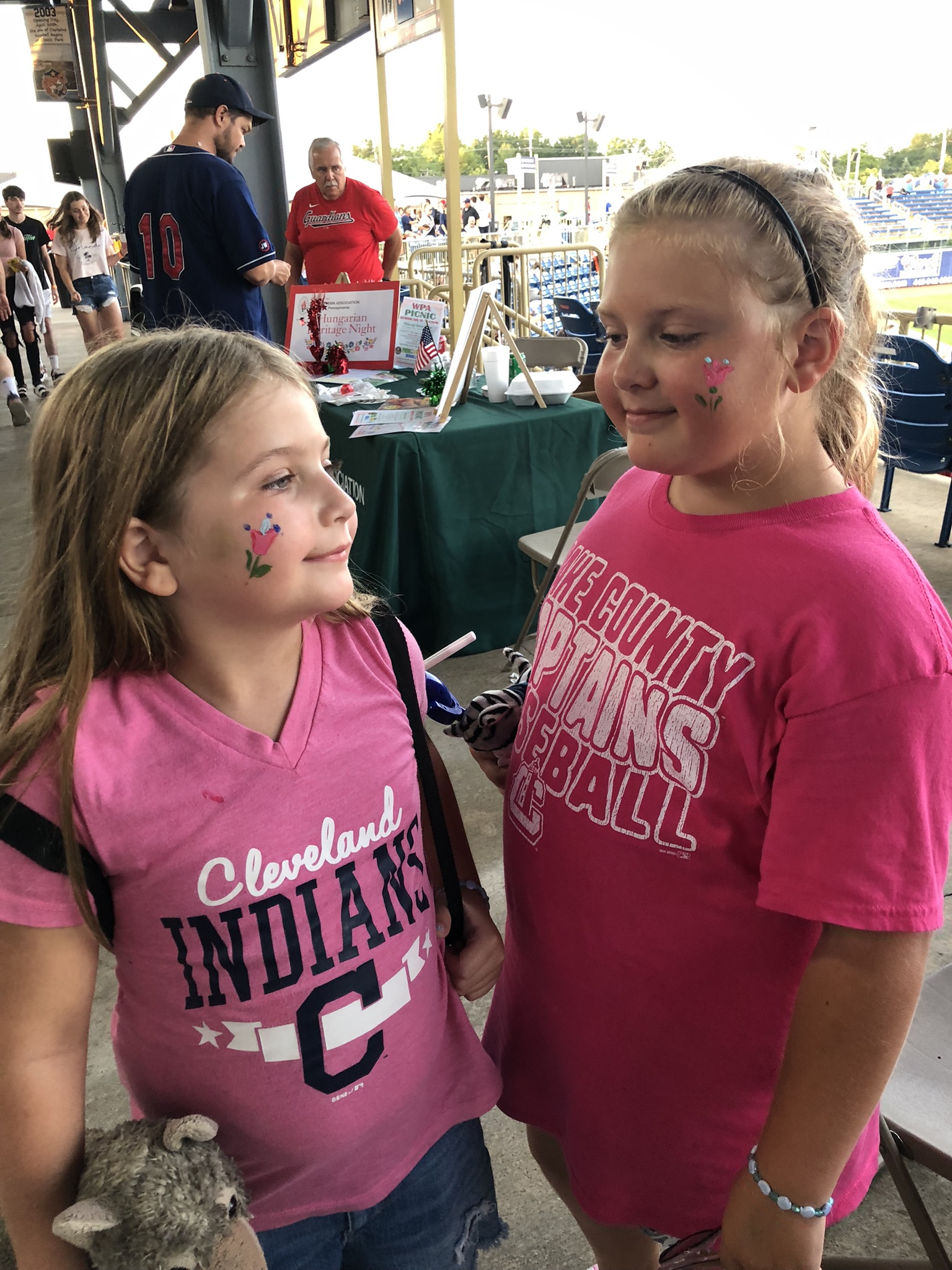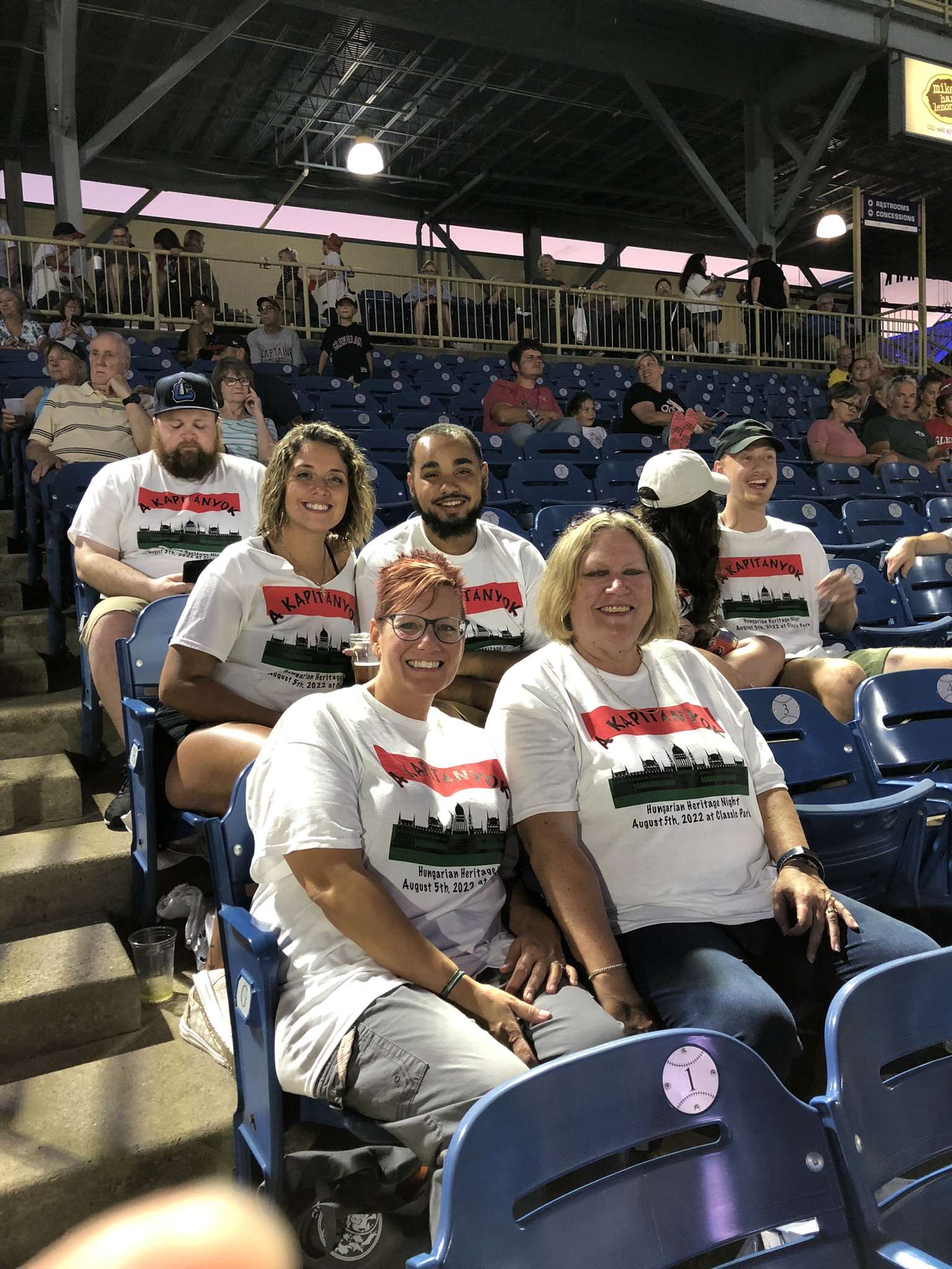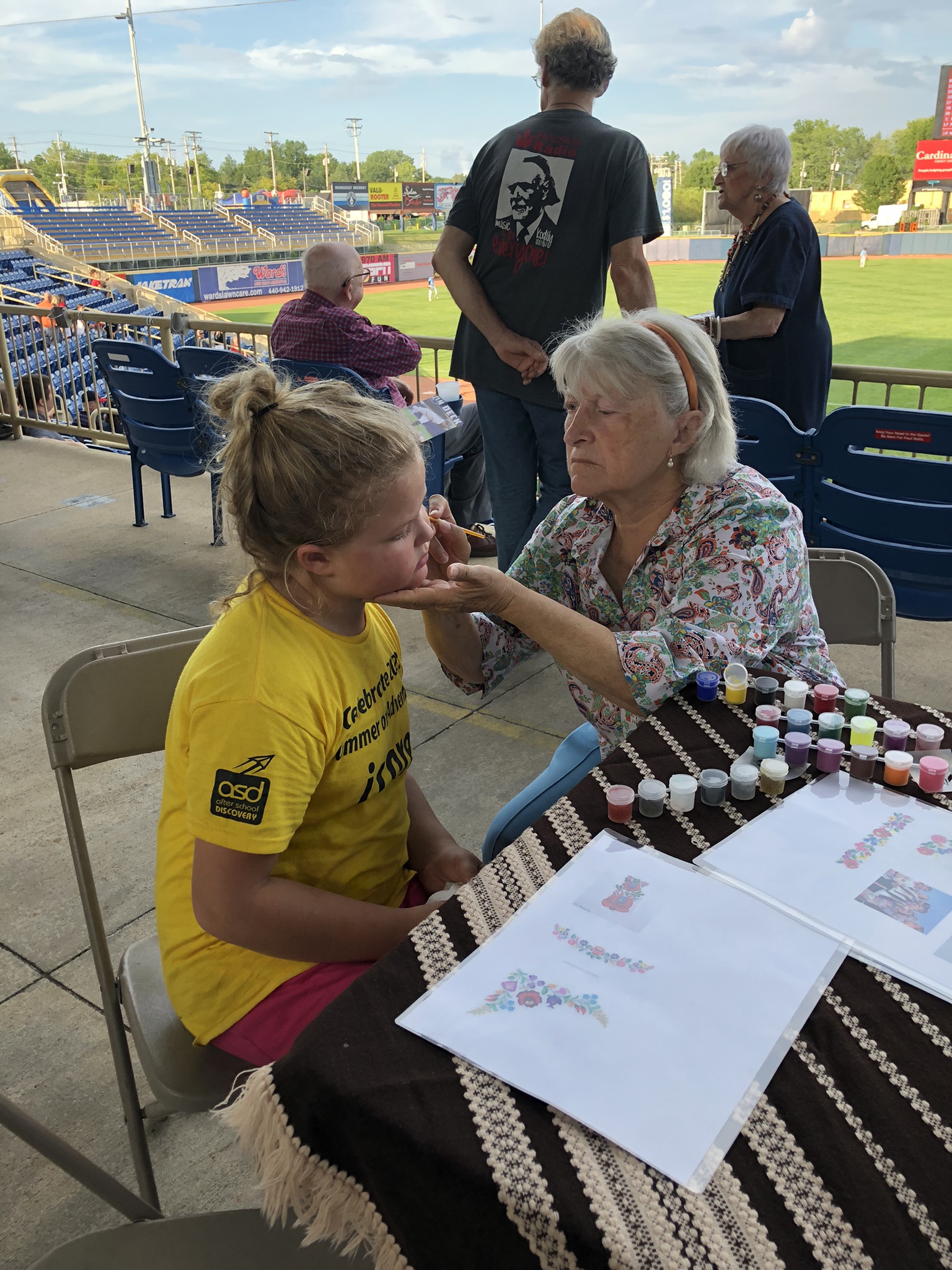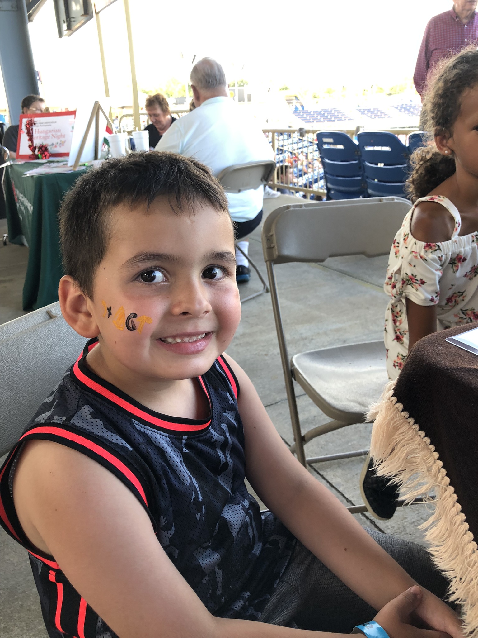 August 5th, Friday night, proved to be a great night at the Captains’ Ballpark in Eastlake…it did not rain, a soft breeze was blowing over the ballpark, the Hungarians were well-represented, and the Captains won the ballgame in extra innings!! During the game the Museum hosted many children as we painted faces with Magyar folk motifs, but we also painted names on arms and cheeks written in ancient Hungarian runic letters called “rovás írás”. A special shout-out to the Magyar Club of Fairport Harbor who arrived in matching t-shirts! It was wonderful working with our Mary Jane Molnár who was wearing her hat as president of the Hungarian Cultural Center of Northeast Ohio and Richard Sárosi who is on the Board of the William Penn organization. Our three organizations have been a part of this event for many years. To see the Magyar colors on the stadium’s jumbotron screen as we sang the Hungarian National Anthem was a particularly moving moment. For more photographs of this special evening, , click “Read More”.