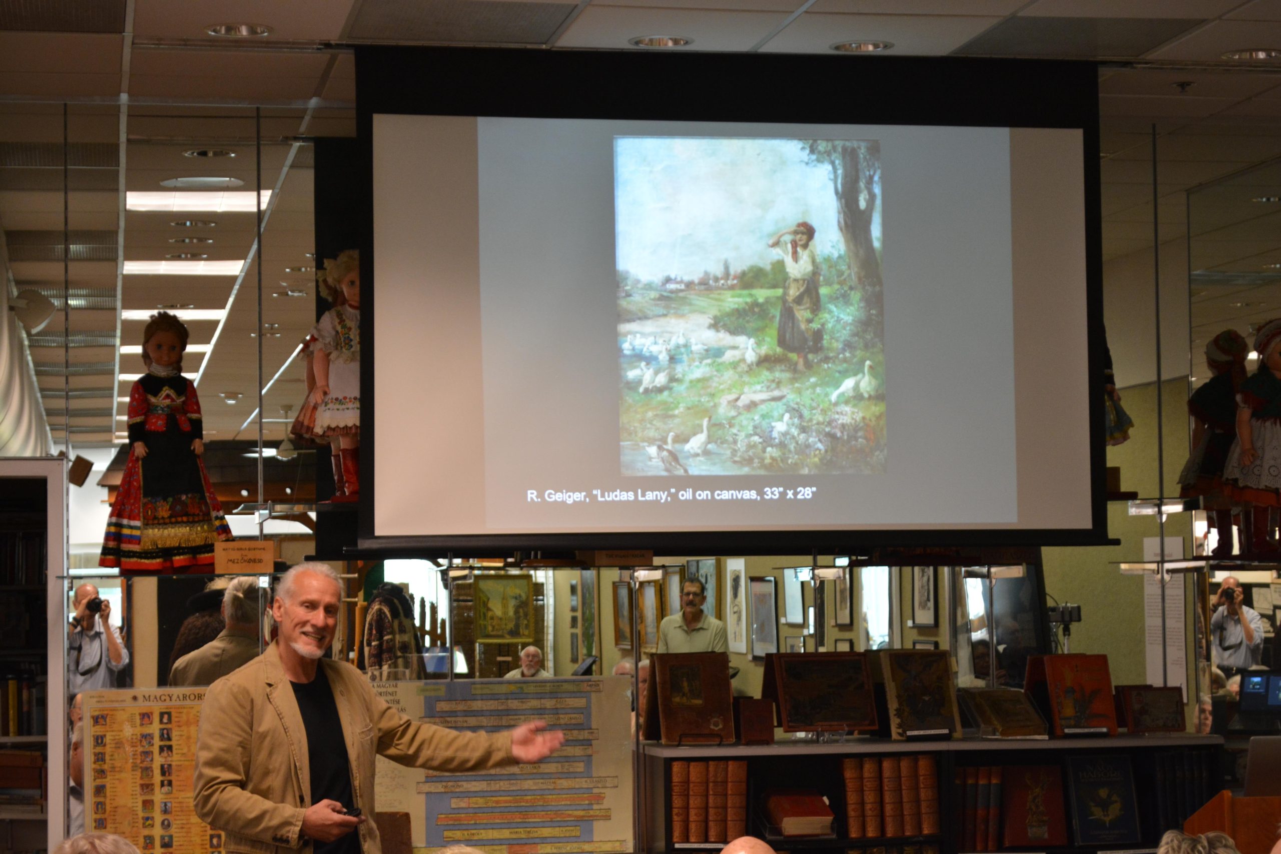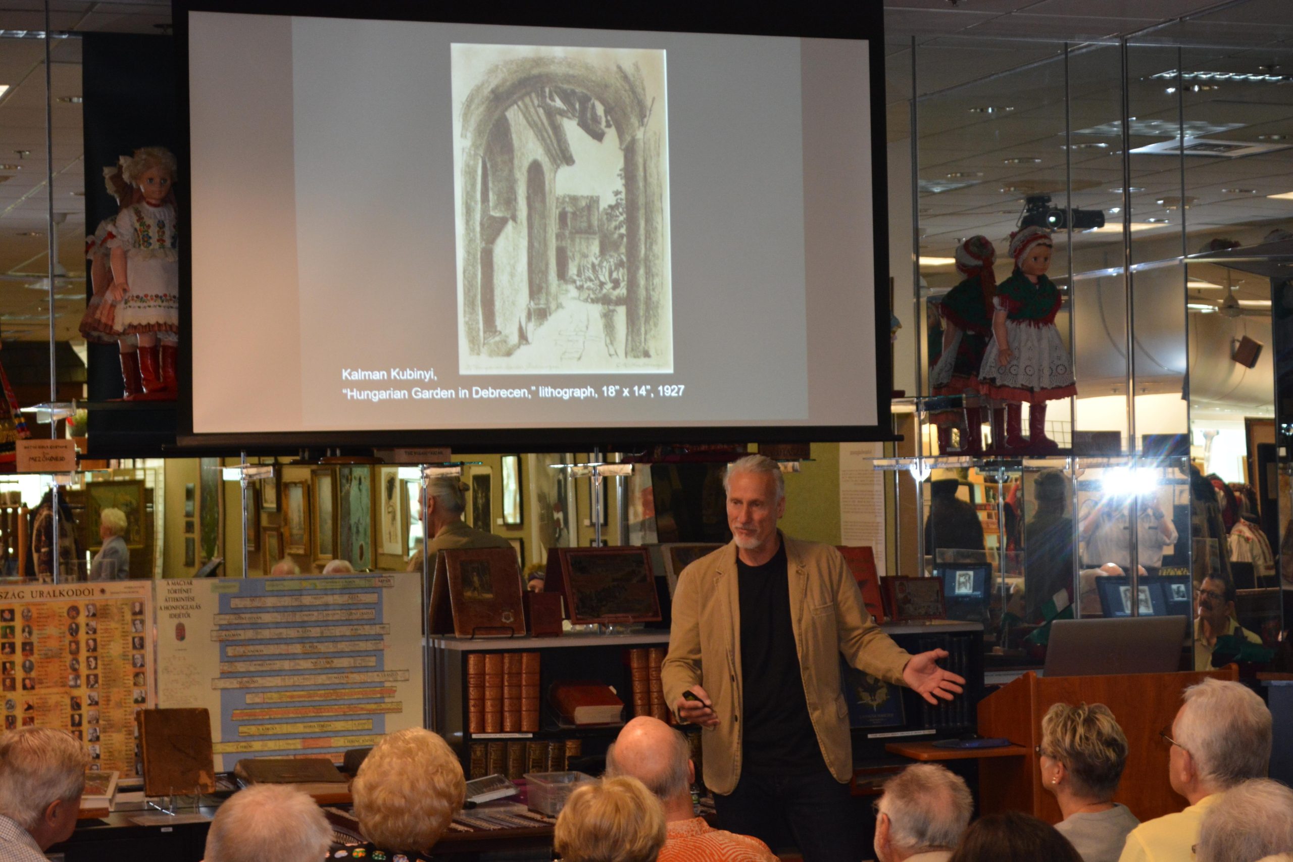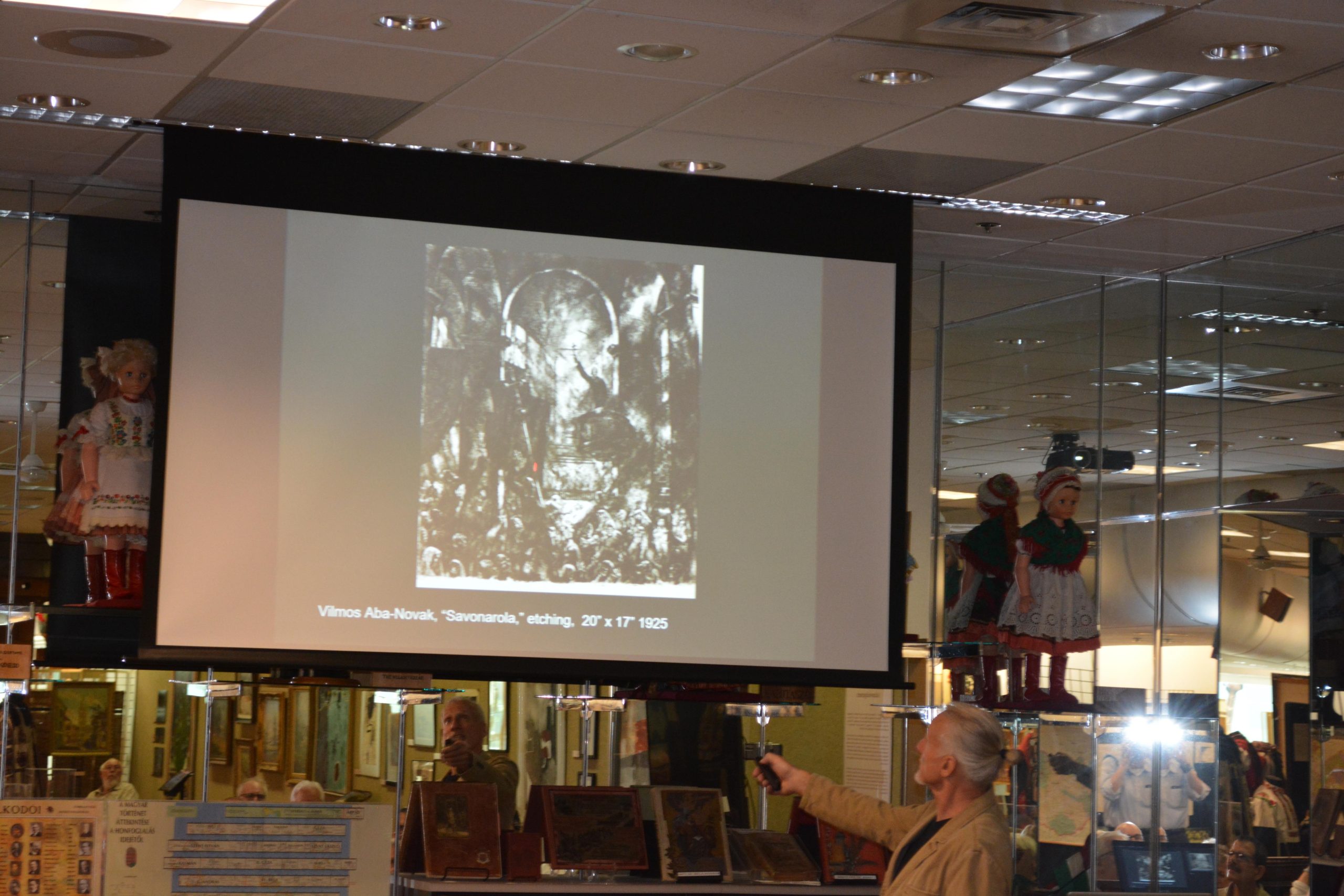 Saturday, May 14, was the Museum’s last program in our 2022 Spring lecture series. It featured well-known artist George Kozmon, who presented a thoughtful review of the 25 pieces of fine art on temporary exhibit in the Museum. These pieces are part of the Museum’s permanent collection, and they were beautifully presented by George, as he explained the techniques used by the various artists (from lithographs, to etchings, and oil paintings). He touched on the style, subject matter and mediums used by the various Hungarian artists, and it was so obvious to those sitting in the audience, that George is also a teacher (not to mention quite a humorous one), who has the patience and experience to deliver specialized material to a lay audience. The program was well-attended, which we were not surprised at, given George’s reputation not only as an artist, but also as a teacher and lecturer. We are proud to have him serving on our Board, and we are grateful for his generosity with his time and talent!