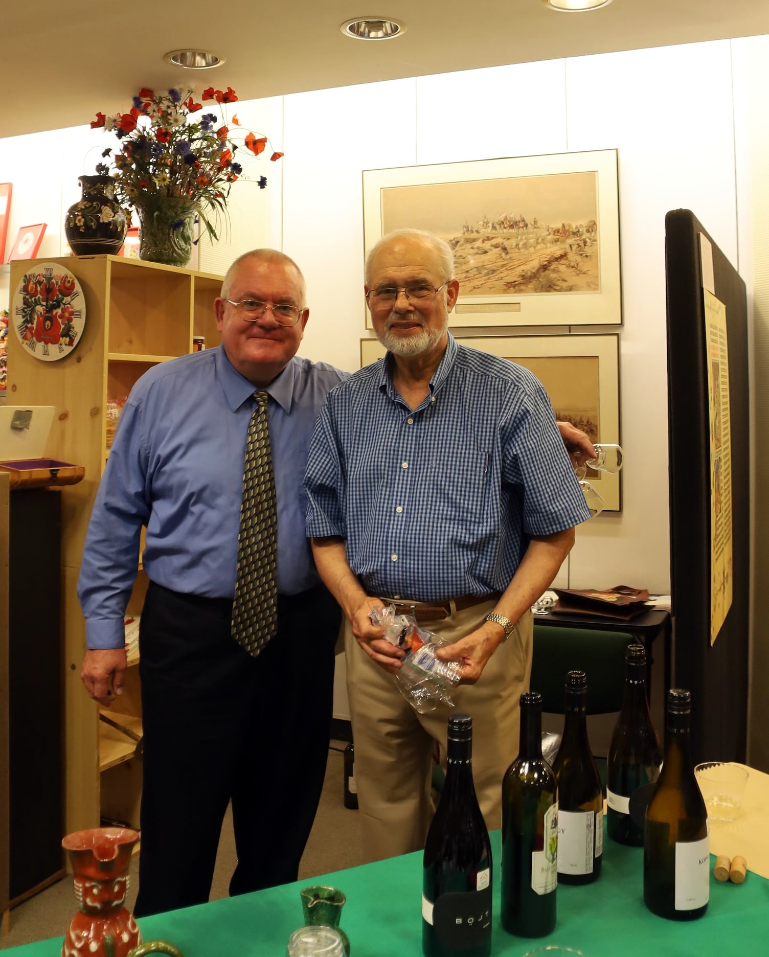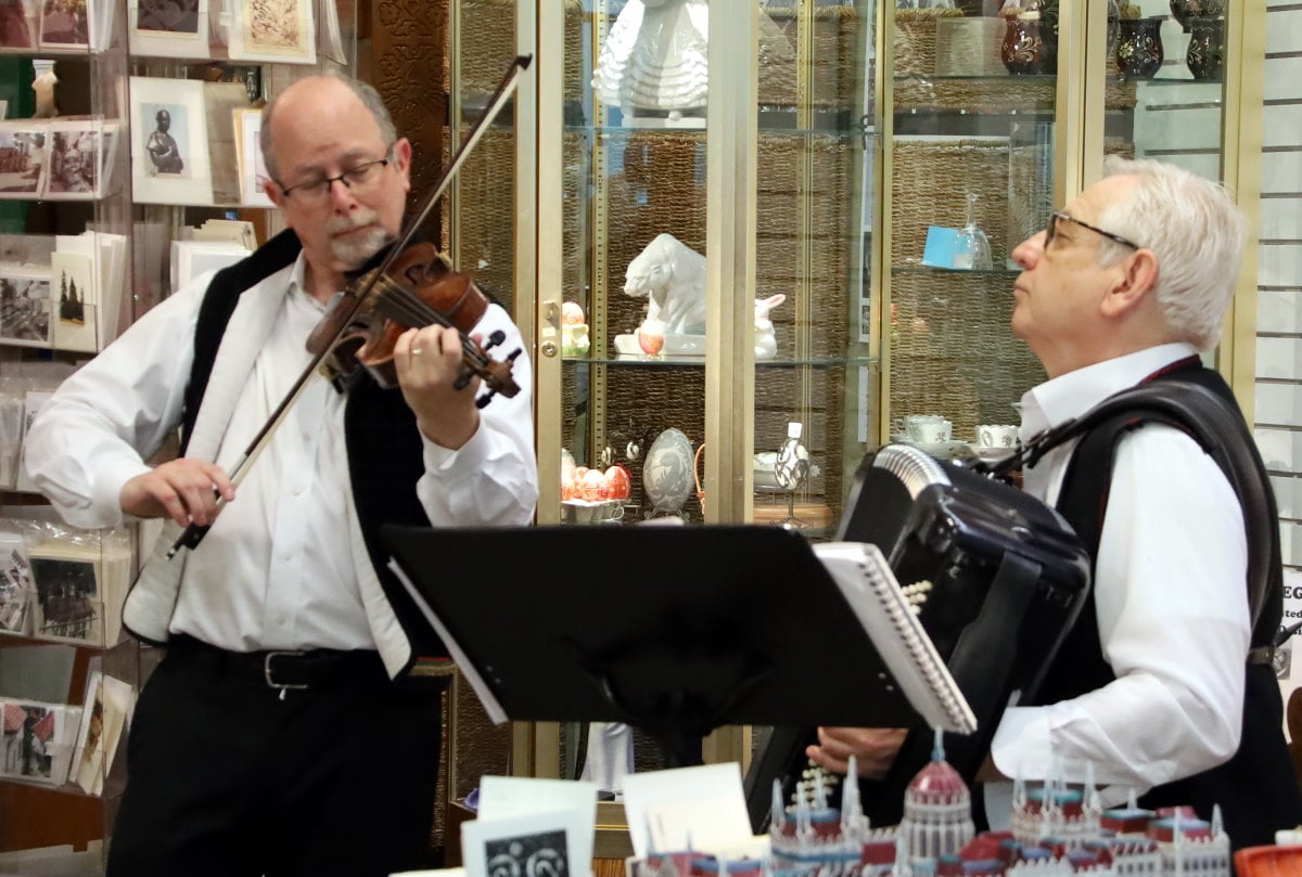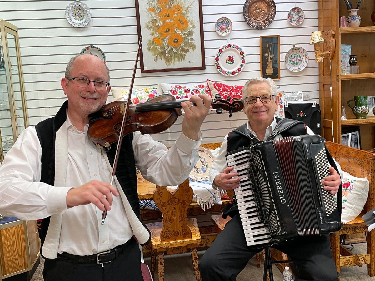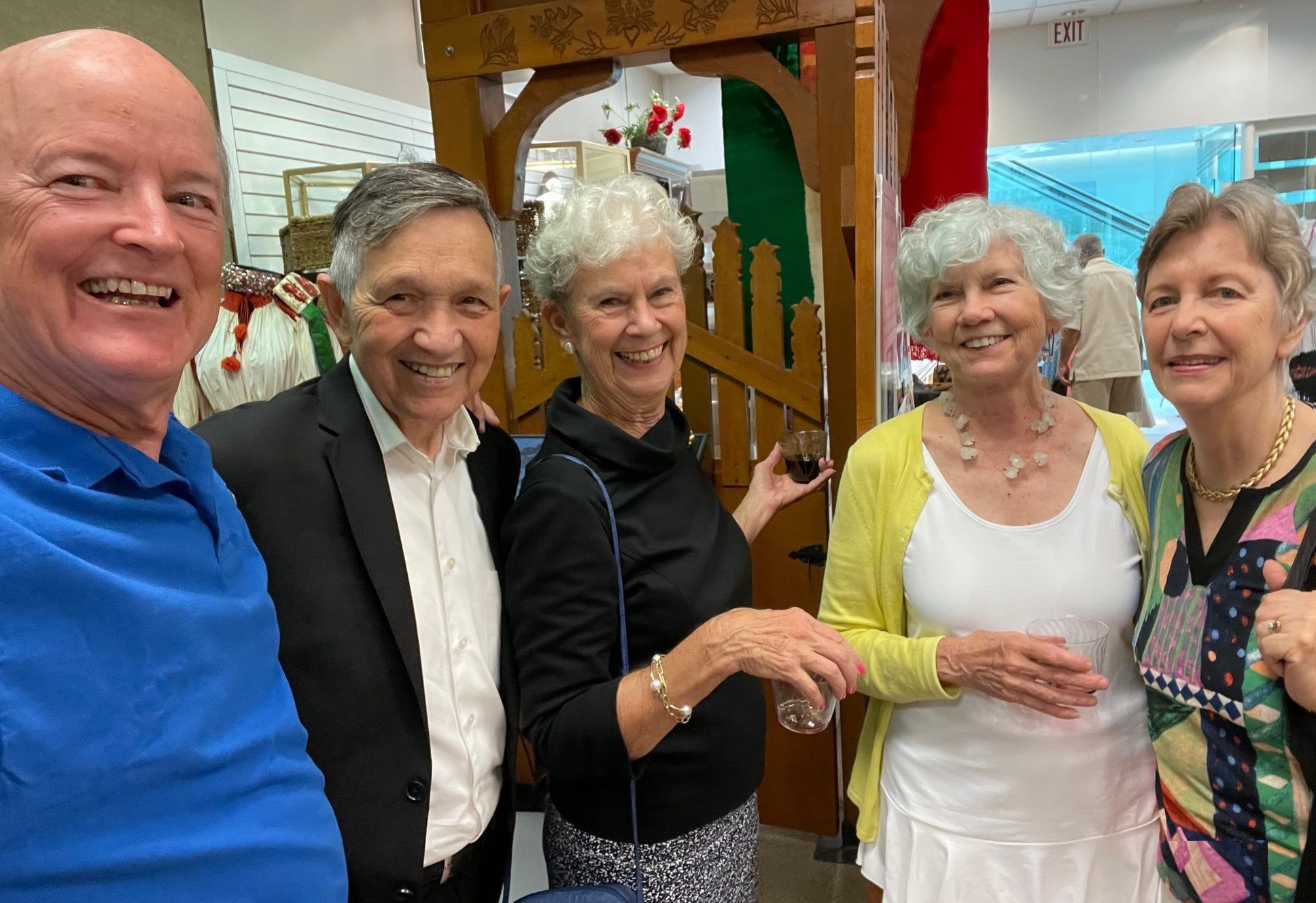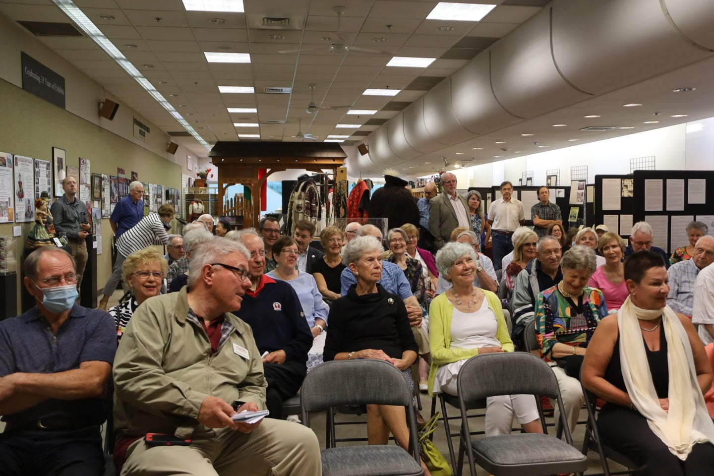 This was a celebration not only of “coming alive” after over a year of being closed due to the Covid pandemic, but of honoring the curator of exhibits, the mainstay of a museum. Over 100 friends of the Museum were present and everyone was in a festive mood. It was wonderful to see so many people gathered again inside the Museum. So many comments of appreciation and compliments of the exhibits were expressed. The assembled lingered around the two tables of refreshments and one table of drinks, including wine. The atmosphere was made more festive by wonderful, lively music performed by Harmonia.