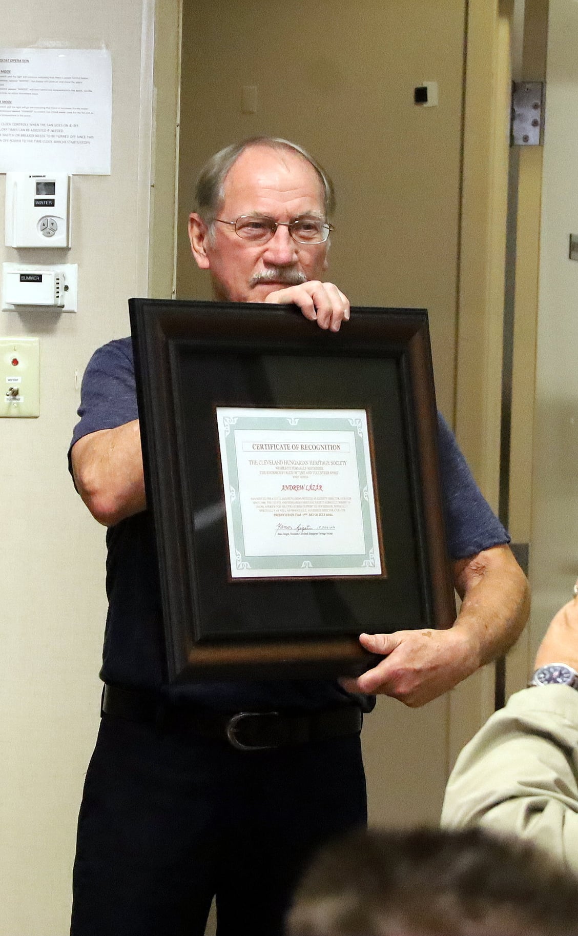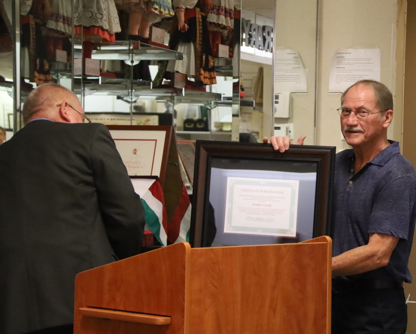 Afterwards János introduced Andrew Lázár to explain the new exhibit entitled: ” Celebrating 35 Years of Exhibits”. During his introduction, János expressed the following sentiment: “Bandi has been our Exhibits Director, Curator for thirty-six years, and as such, our only Exhibits Director, Curator. Bandi has created and displayed no less than sixty-eight Museum Exhibits from April 1986 through November 2019.” He also thanked Ari, Bandi’s wife, for preparing the technical portion of the exhibits with the tablets. He then honored Bandi with a beautifully framed Certificate of Recognition”.