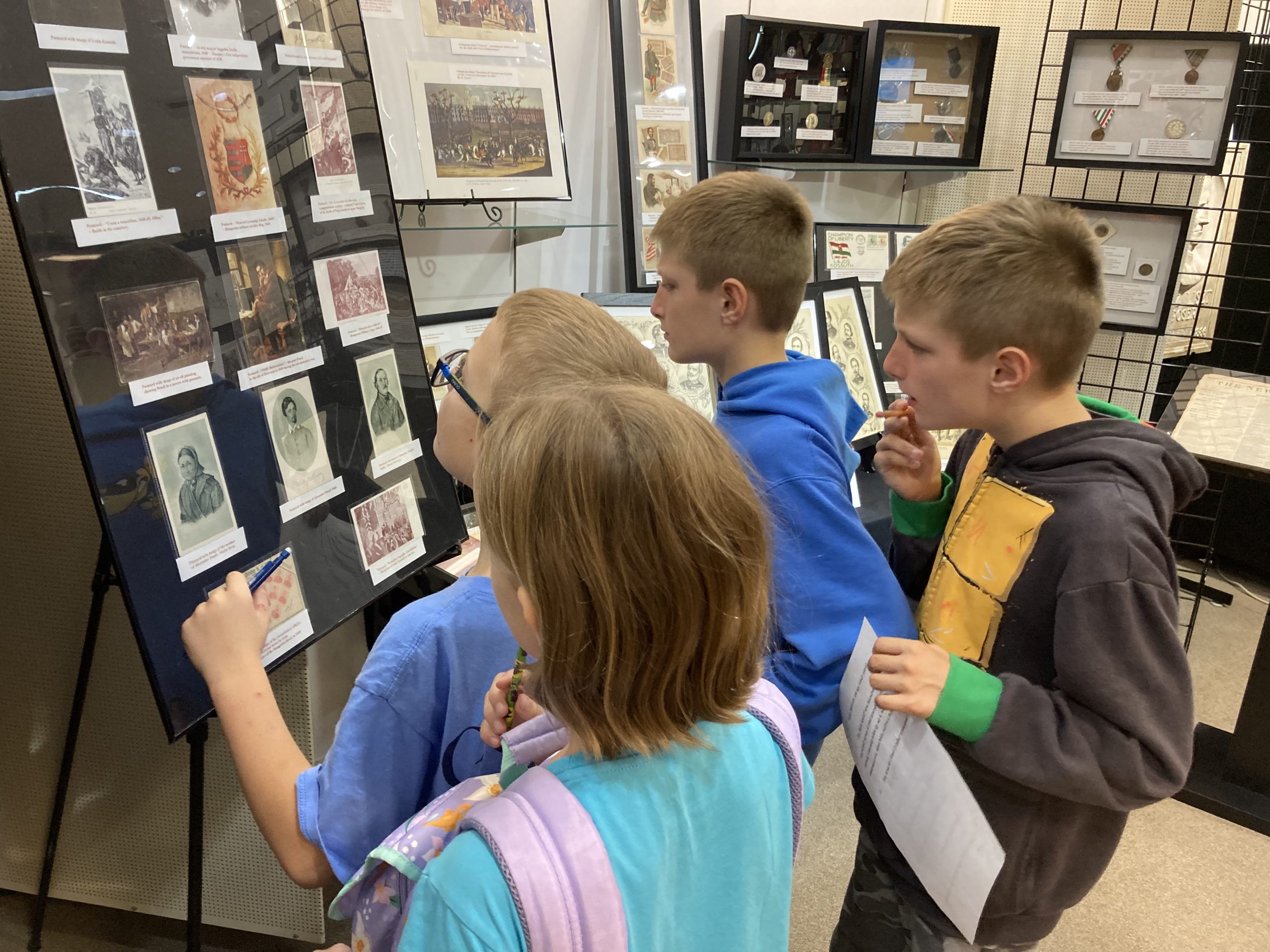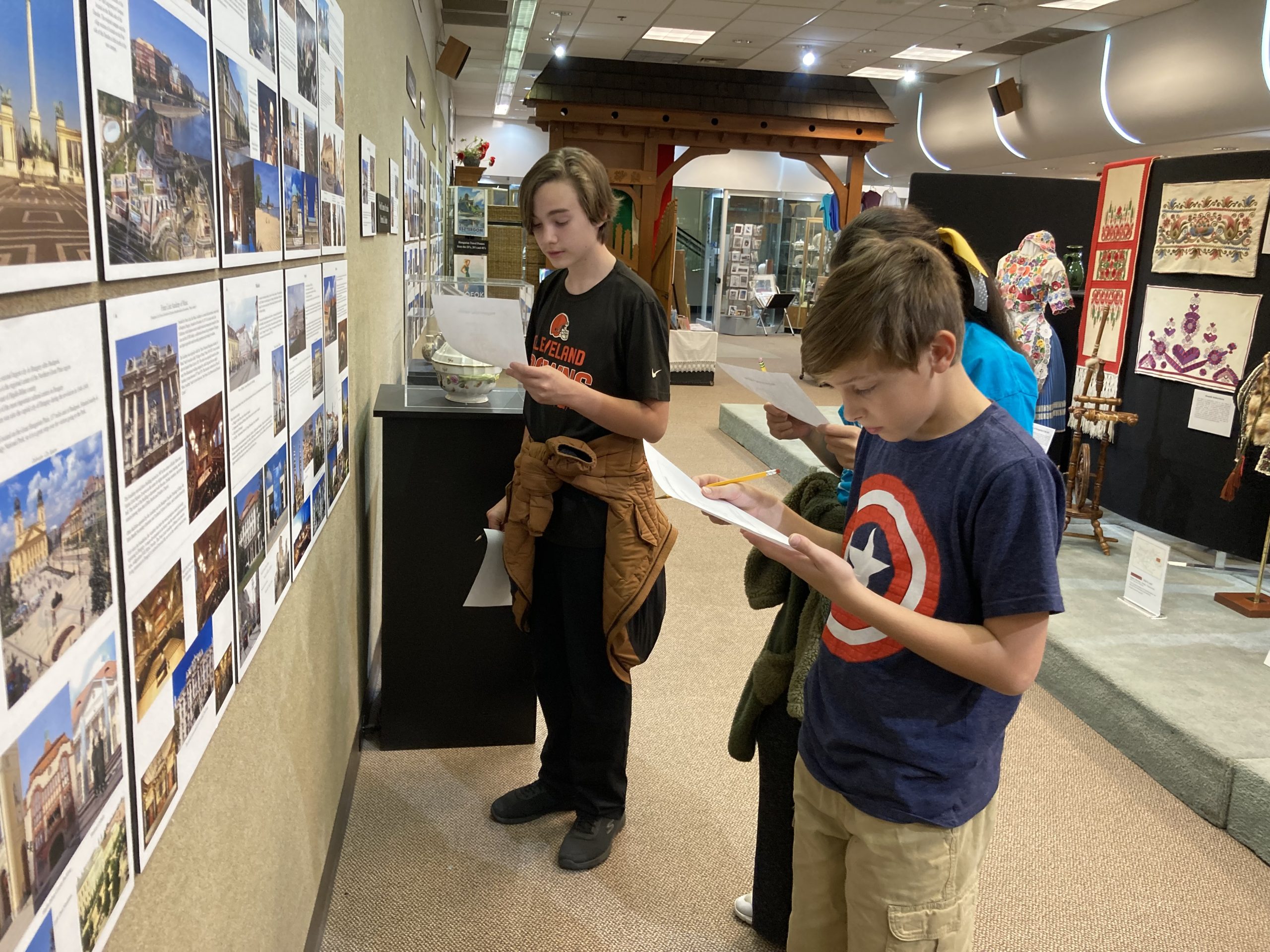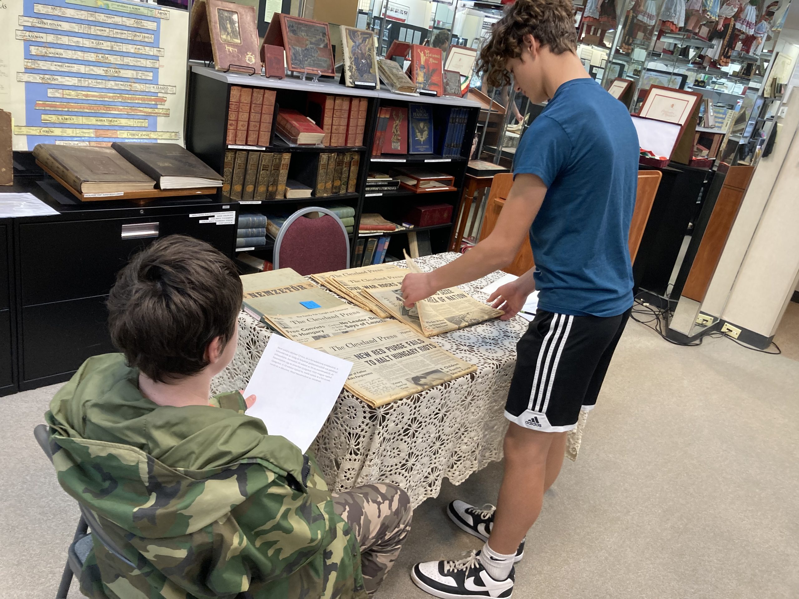 Monday evening , October 14th, was a special occasion because a group of students from the Cleveland Hungarian School and their teachers came to visit the Museum. This field trip was organized by the School’s principal, Endre Szentliralyi. Some of the students spent time hunting for answers to questions as they explored the exhibits. Others worked on crossword puzzles; the answers to the clues were found in the exhibit featuring cities, parks, castles, architecture, and many more interesting places in Hungary. Some students looked through copies of the Cleveland Press newspapers from 1956 that featured the events of the 1956 Hungarian Revolution. The kids were treated to homemade chili prepped by Janos Szigeti, president of our Board. It was a great hour spent together, helping these young Hungarians become familiar with the Museum’s rich material.