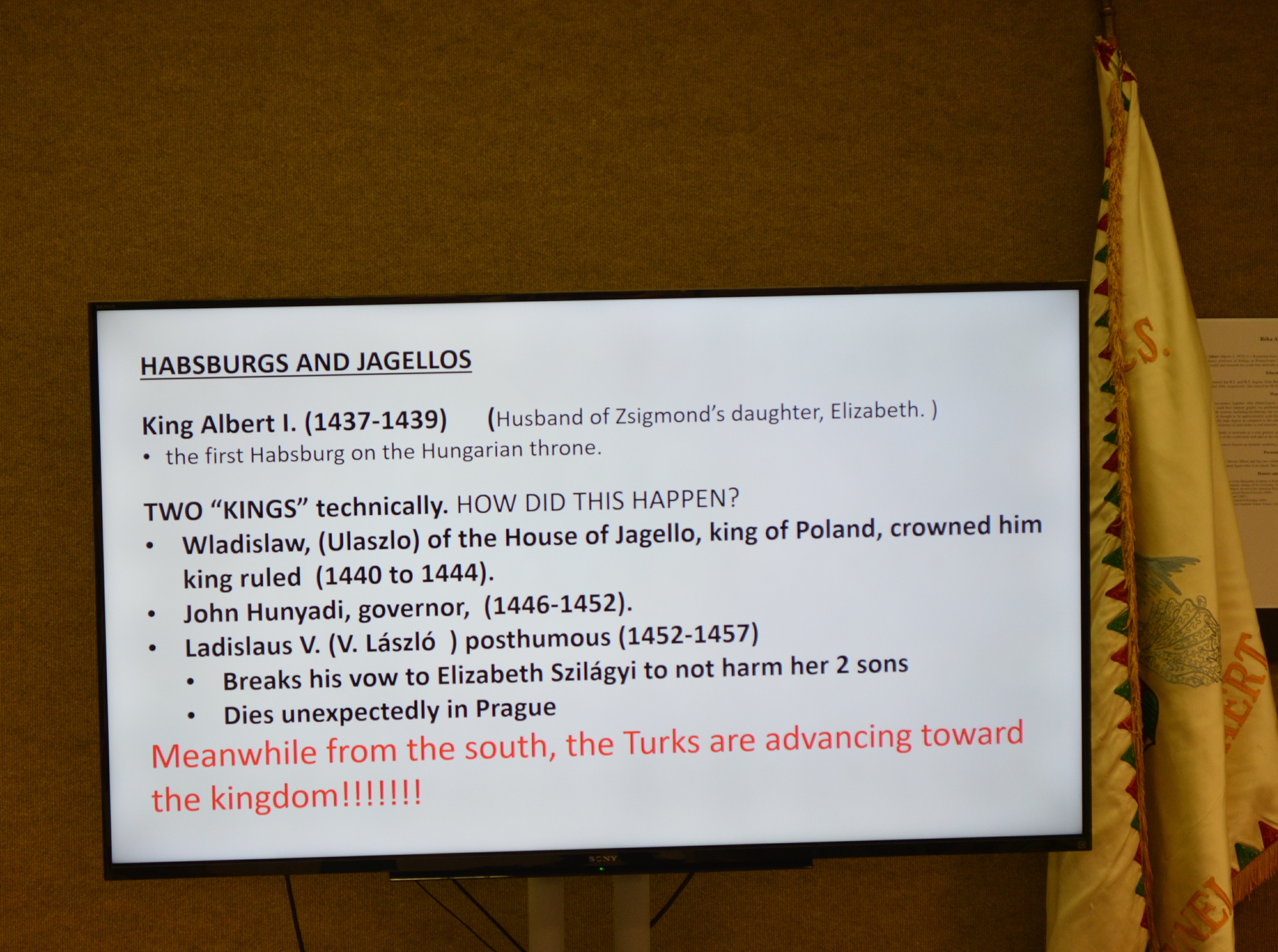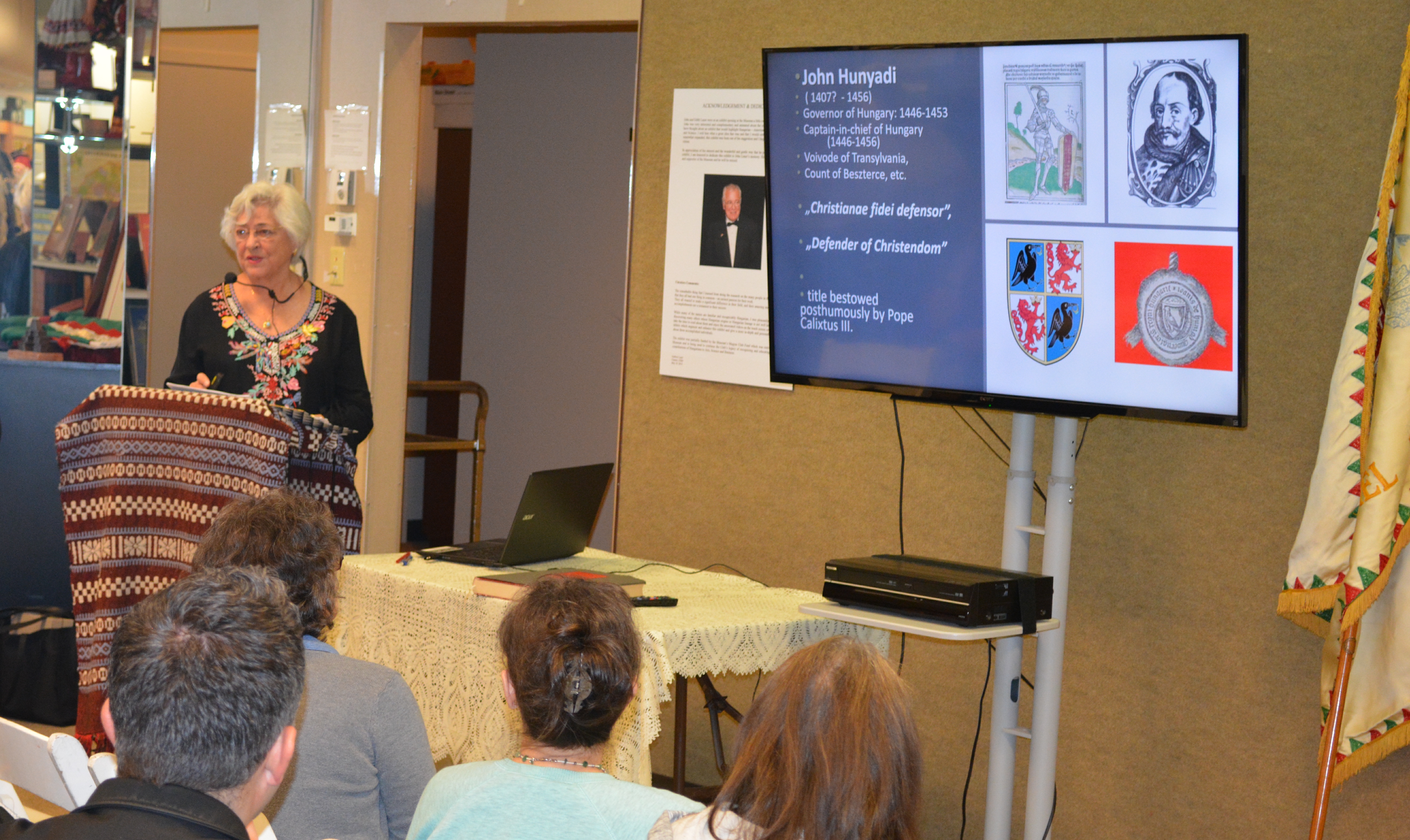 Ildikó Peller was our speaker on October 13th, when an attentive audience gathered at the Museum to listen to a presentation on the life and times of Elizabeth Szilágyi. Her famous husband and her royal son have defined Elizabeth Szilágyi’s role in Hungarian history, yet she was a remarkable woman in her own right. Mrs. Peller gave the audience a very well researched look into 15th century Hungary, the challenges it faced from the Ottoman Turks, the power struggles to gain the Hungarian throne, and the role the Szilágyi and Hunyadi families played during this turbulent era. After her presentation, Mrs. Peller took questions from the audience, and the discussions continued as our guests partook of the refreshments we traditionally serve after our programs. It was nice to see new visitors to the program!