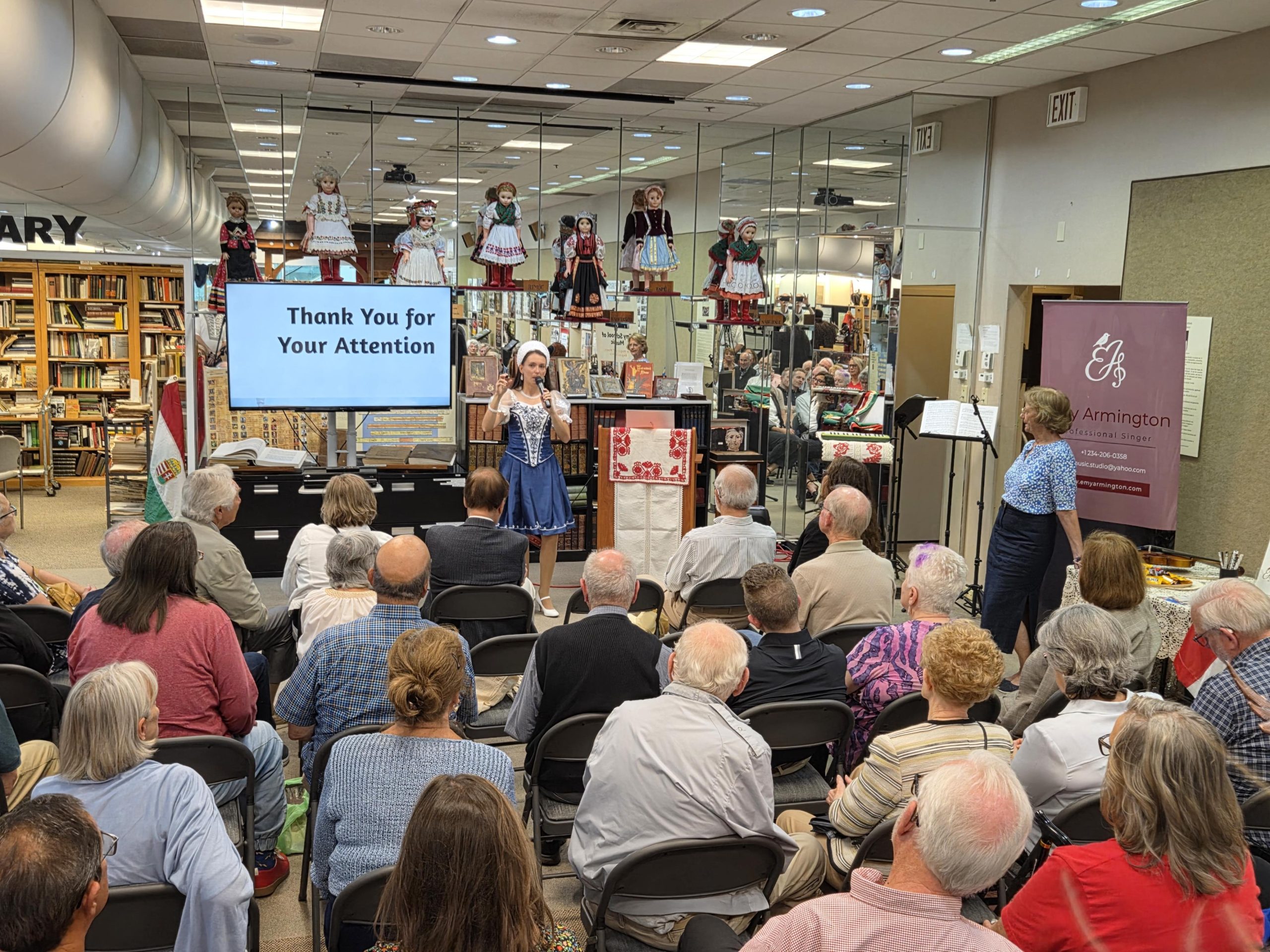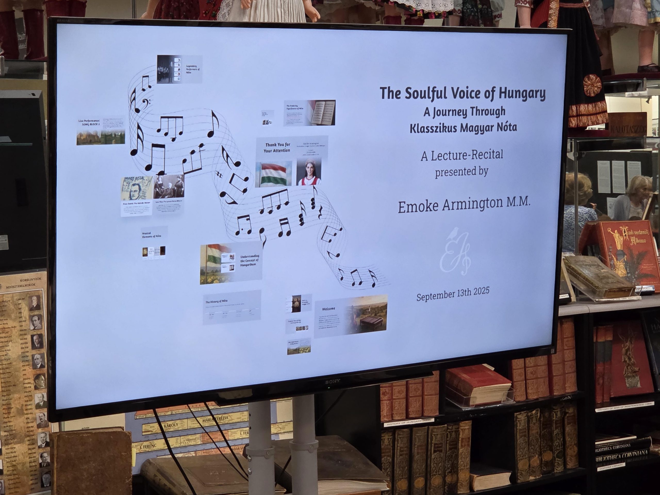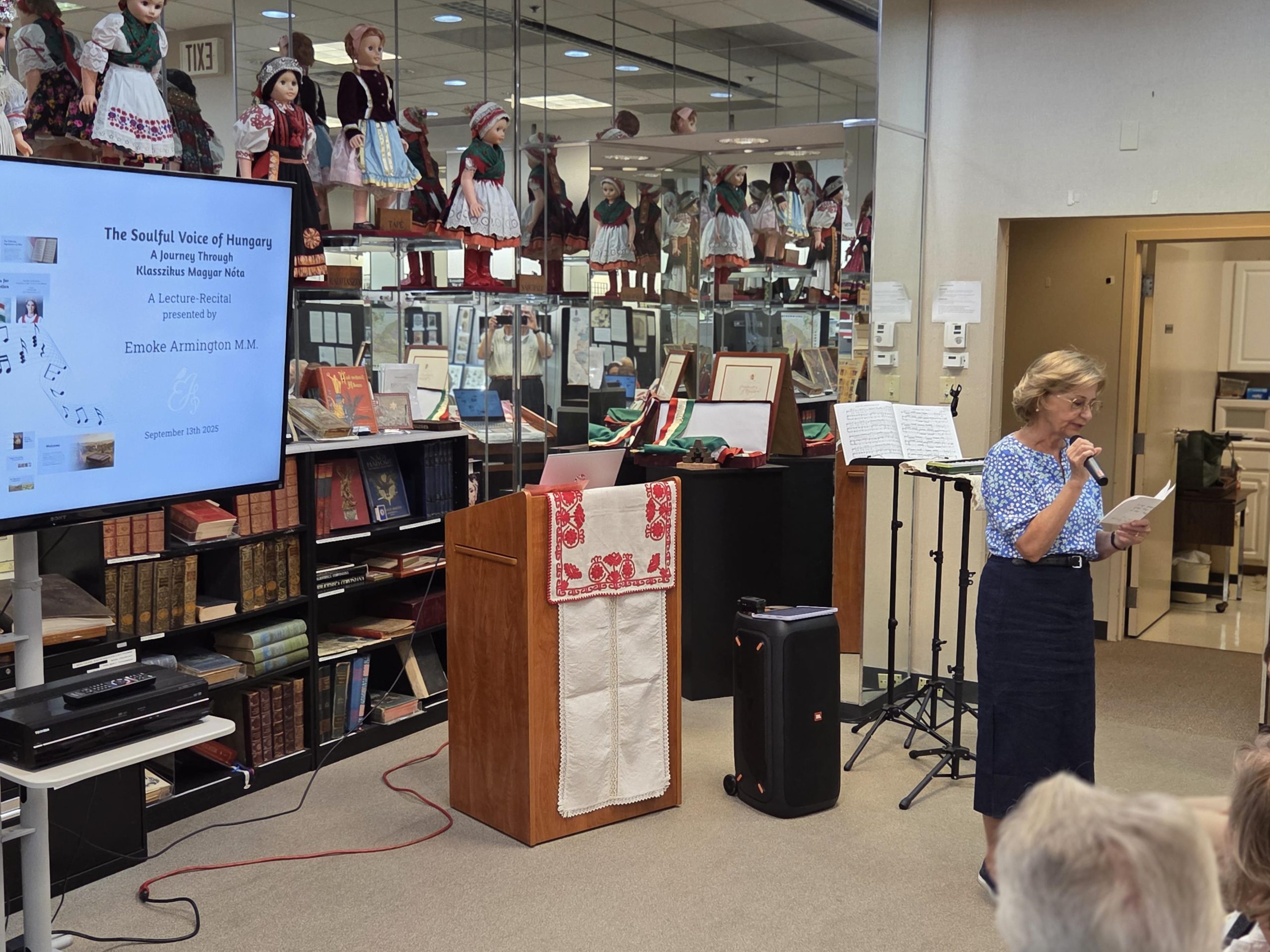 The Museum was packed as Ms. Emőke Armington delivered her outstanding presentation, which featured historical and musical insights to this unique art form, as well as live performances of “Nóta” songs. We heard a wide variety- some lively and humorous, some soulful, some hauntingly expressive. Some were sung with accompaniment and some were sung a capella. Both the lyrics as well as the melodies that Ms. Armngton chose, were perfect examples of the wide scope of songs that fall under the “Klasszikus Magyar Nóta” umbrella. We were able to “hear” how the “Nóta” serves as a bridge between the folk and the more classical forms of Hungarian music.