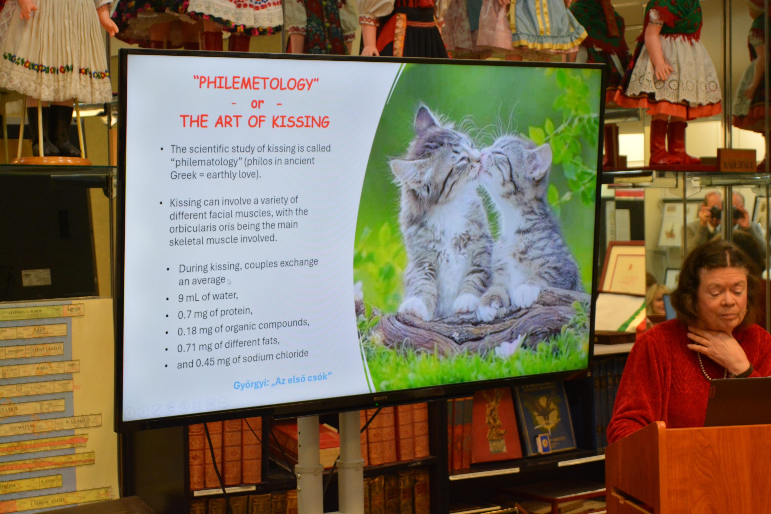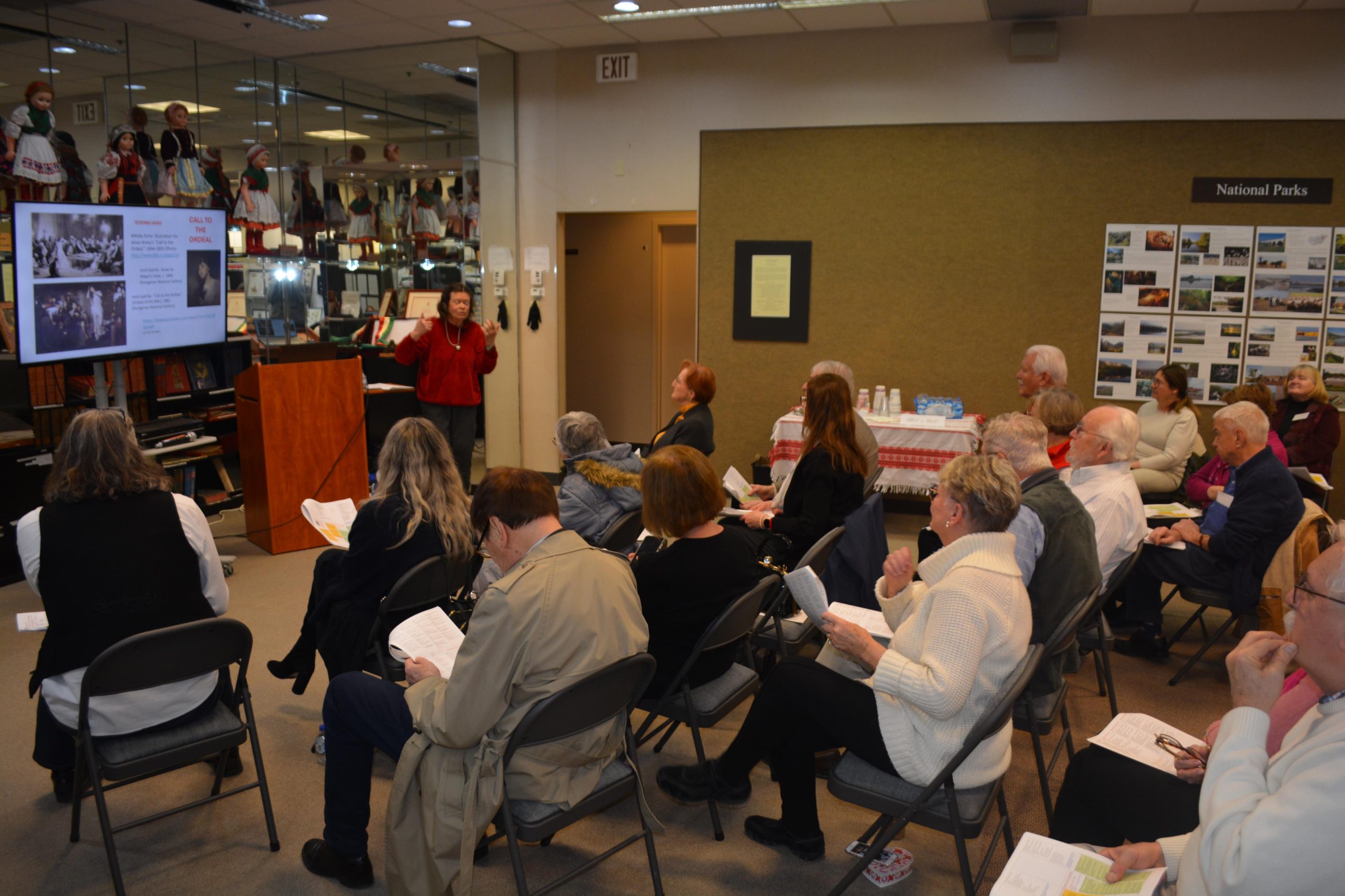 Márti’s approach to literature included poetry, ballads, folk songs, lyrics, and librettos. Her examples of each included excerpts from operettas, clips from rock operas, and live recitations. We heard poems by Petőfi, Tompa, Balssi-Bálint, Weöres, Ady, Radnóti, and many more. The poems touched on spousal love, unrequited love, forbidden love, sacrificial love and tragic love. Some poems made you smile, and others left you feeling sorry for the complex lives some of these poets lived. Márti’s presentation was witty at times, well-researched, and she connected modern culture to the main topic. The handout we received included her beautiful English translations of the Hungarian material. It was a valuable addition to the program because everyone present was able to connect with the theme. Her PowerPoint was well-paced, and her slides connected to the magyar experience in some form or another.
