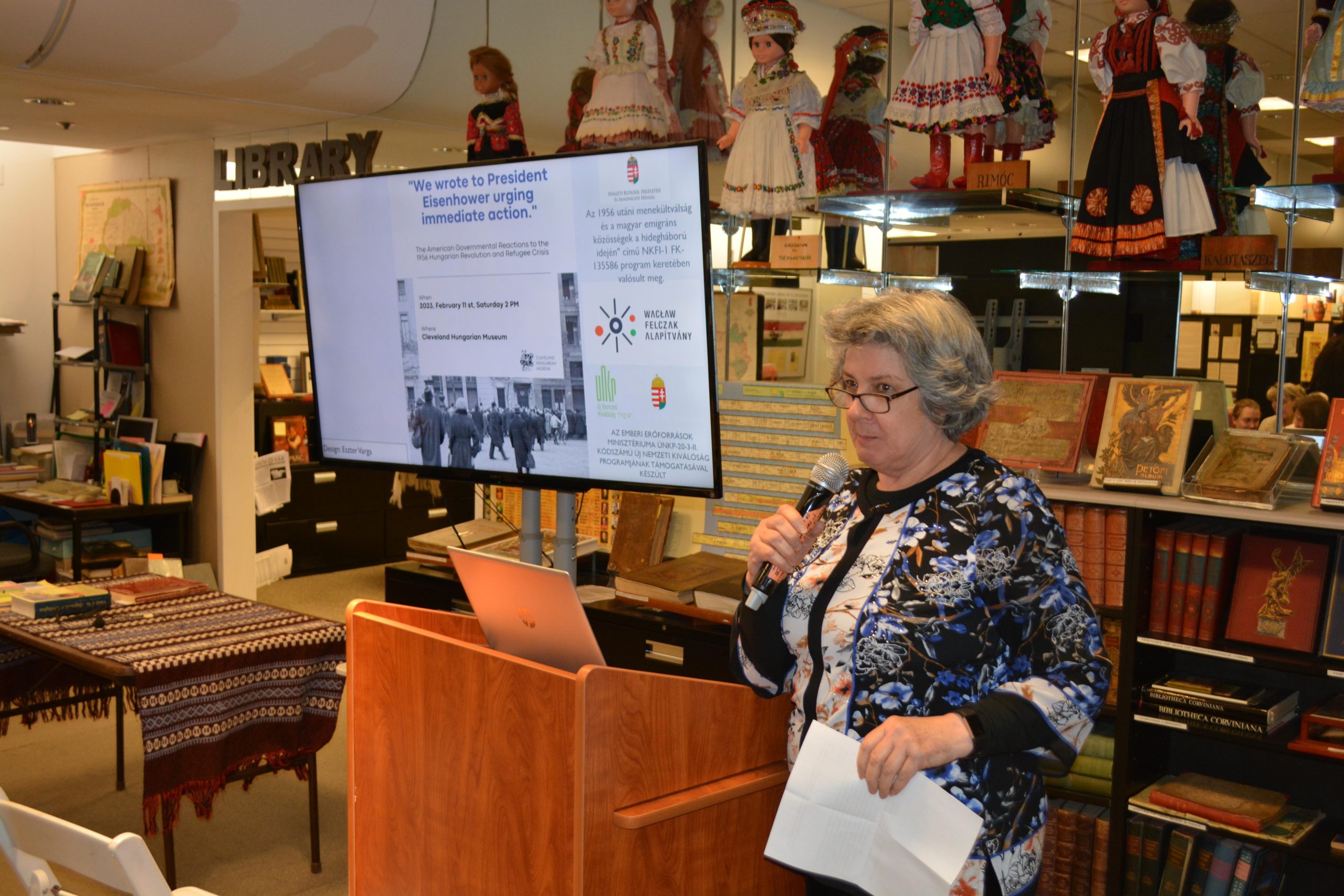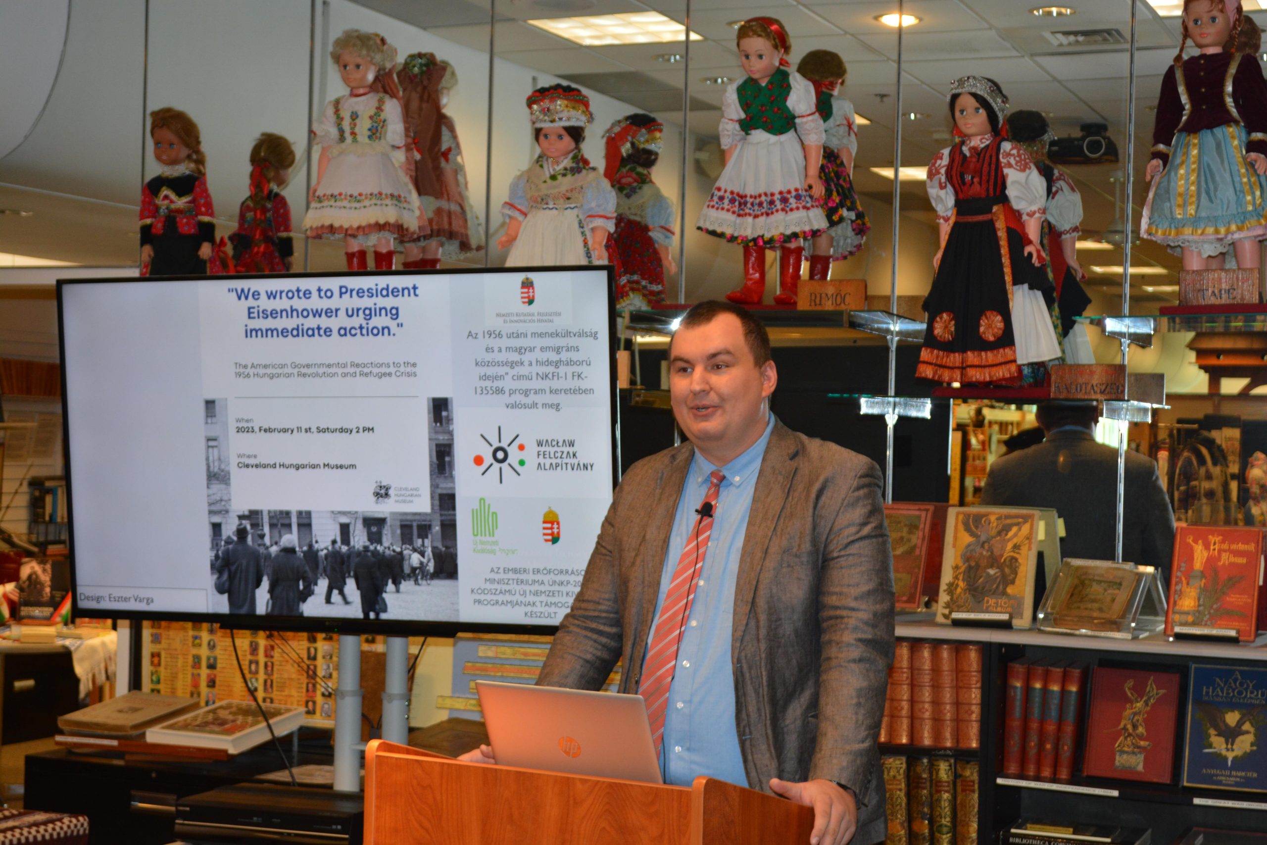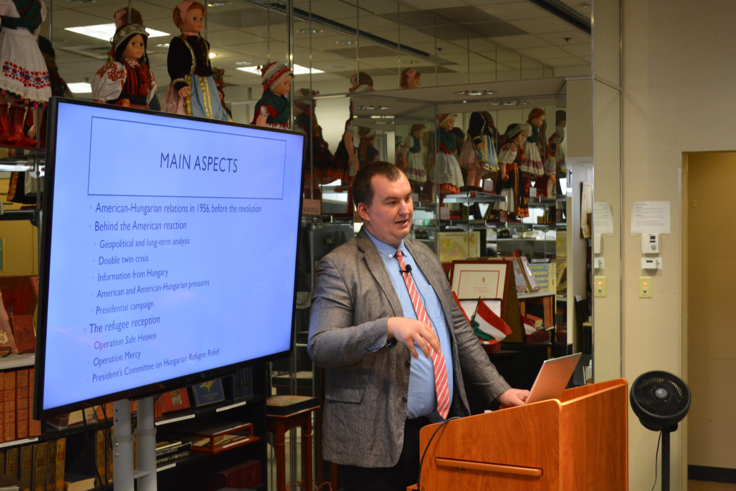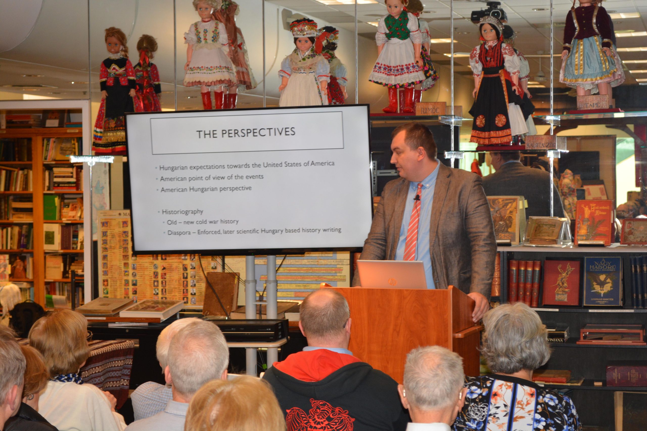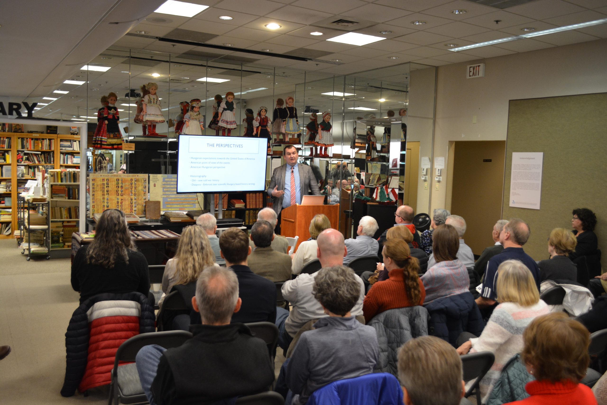 Zsolt Máté, our speaker on February 11th, presented riveting details about the 1956 Hungarian revolution using various source materials from several presidential libraries, US Department of State archives, and oral histories. His talk illuminated three divergent perspectives on the revolution: Hungary’s expectations, the American governmental point of view, and the American Hungarian perspectives. He situated the revolution into the context of the Cold War, which governed relations between the US and the Soviet Union at that time. He explained that the State Department was observing and thinking strategically about the discontent existing in the satellite countries. Of the options laid out, the one adopted by the Eisenhower government was not to intervene should the revolution occur either in Poland or in Hungary. Throughout the bloody and painful days of the revolution, the Hungarian people hoped for and pleaded for support and intervention. Hungary had not yet realized the US’s position, made even before the revolution began, that though the US might applaud their aspirations for freedom and independence, it would not actively support them. The revolution was brutally squelched. Over 200,000 refugees, 2% of the nation’s population sought refuge outside their country. Zsolt explained the subsequent efforts globally to garner support and aid the refugees. The year, 1956, planted Hungary firmly in the world’s consciousness: Zsolt explained how surprised he was when traveling abroad to learn that Hungary was most well-known for its fight for independence. This was the most frequently cited fact known about Hungary.